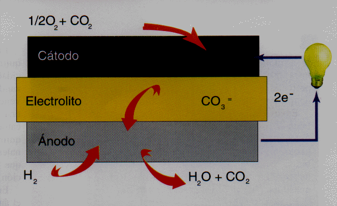 Las celdas combustibles son dispositivos electroquímicos que permiten convertir hidrógeno en electricidad, con una alta eficiencia y en forma limpia, utilizando principios parecidos a los de una batería convencional. Al igual que en una batería (Fig. 2), una celda combustible posee dos electrodos (ánodo y cátodo) en los cuales se produce una reacción electroquímica. Pero a diferencia de las baterías convencionales, su capacidad de generar energía no se agota, ya que puede ser " recargada continuamente por la adición de hidrógeno y oxígeno.