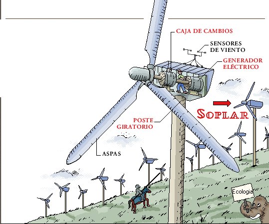 Las Aspas: El aire pasa sobre la parte superior del aspa más rápido que sobre las parte inferior. La velocidad más alta sobre el aspa provoca un ascenso o tirón hacia arriba que la hace girar sobre el eje que conecta al generador. Este principio es el que mantiene las aves y aeroplanos en vuelo.