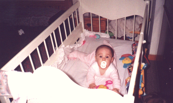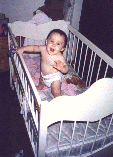 jugando en la cuna, salta tomada de las barandas y le encanta el sonido