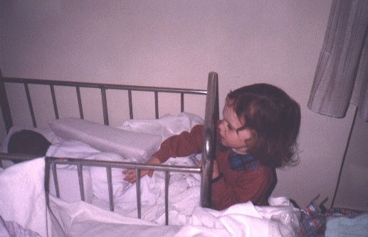 acariciando, en la cuna del hospital. |